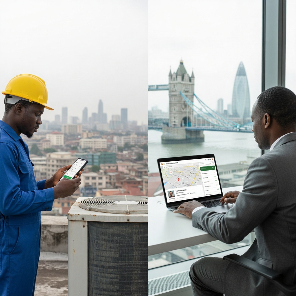 Maintenance technician in Nigeria using a mobile app to log a repair job, while a facility manager abroad watches status updates on a laptop