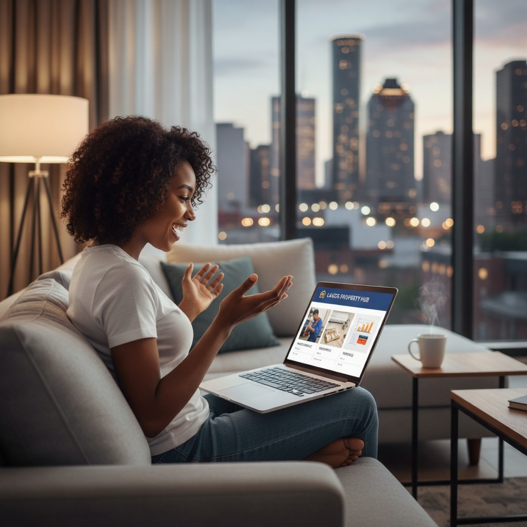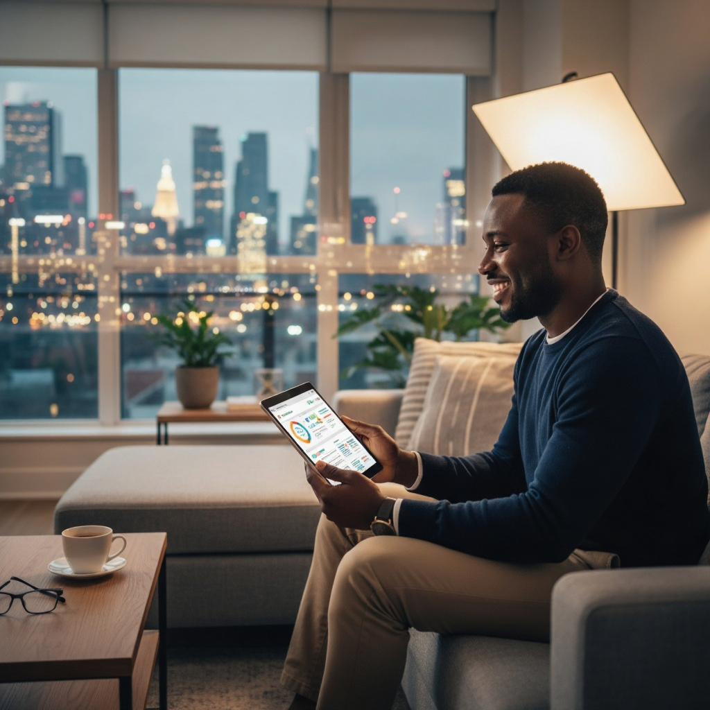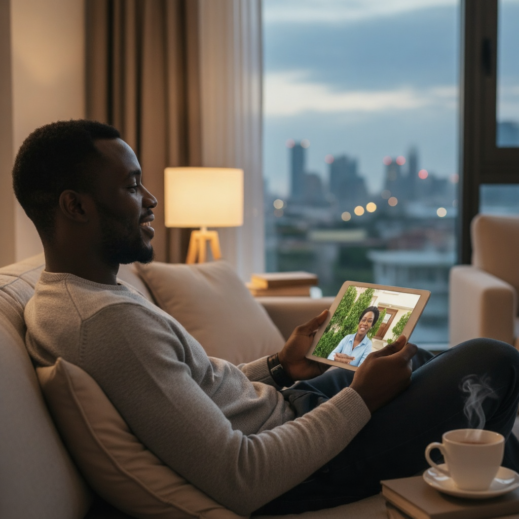 Nigerian professional living abroad relaxing at home while viewing property update videos from Lagos on a tablet
