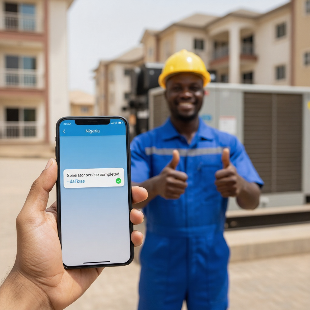 Notification: ‘Generator service completed – daFixas’, with Nigerian site technician giving thumbs up.